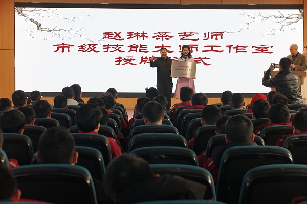 会上,重庆市万州区人社局局长雷传亮为赵琳茶艺师市级技能大师工作室授牌。该工作室是由中共重庆市委组织部和重庆市人力资源与社会保障局认定的市级技能大师工作室,是学院第一个市级技能大师工作室。