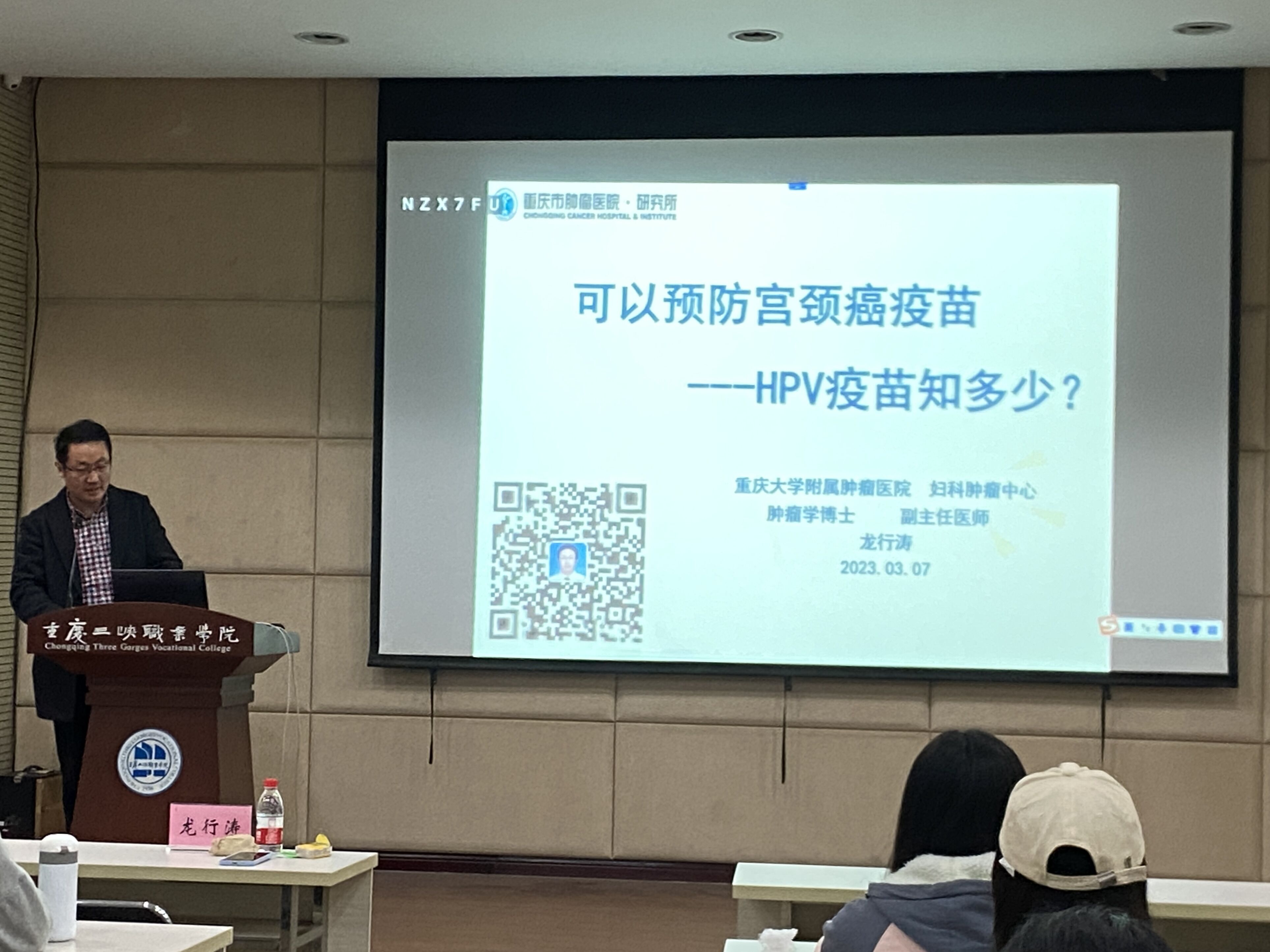 在2023年“三八”国际妇女节来临之际,为关心学院女教职工的健康,进一步提高女教职工自我保护意识和健康生活理念,3月7日,学院工会特邀重庆大学附属肿瘤医院妇科肿瘤中心副主任医师龙行涛博士在博雅楼207开展“可以预防宫颈癌疫苗---HPV疫苗知多少?”女性健康知识讲座。