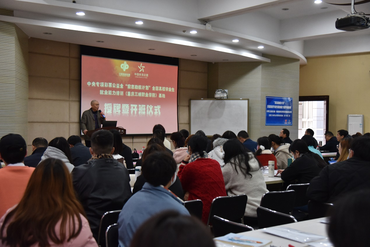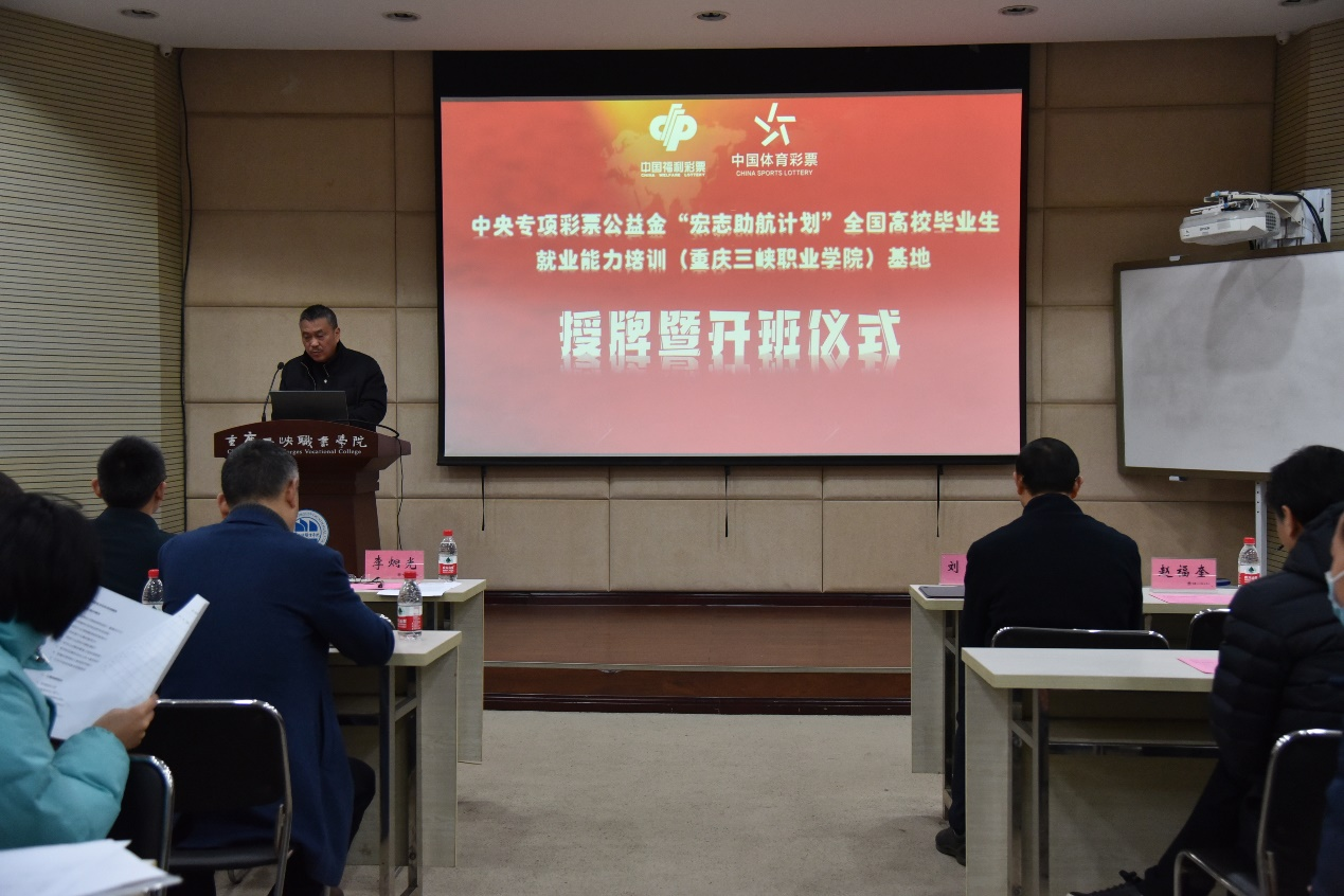 随后,重庆市大学中专毕业生就业指导服务中心唐雪平主任为我校教育部“宏志助航计划”全国高校毕业生就业能力培训(澳门金年会app下载官网)基地授牌。