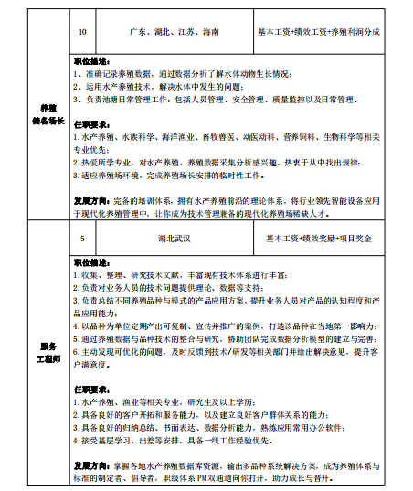 公司重视人才发展,坚持“天生我材必有用”的用人理念,公司启智学院针对员工发展规划制定专项人才培养计划,并面向行业从业人员(养殖户、技术人员、养殖场长等)提供专业的技术与管理培训、咨询等相关服务,推动水产行业的发展。优秀的成长型平台,助力每一位员工成为“技术与管理兼备”的复合型人才。